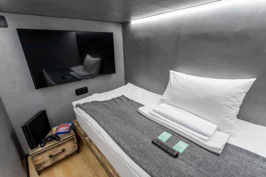 Капсула оснащена односпальной кроватью из натурального дерева с ортопедическим матрасом Ormatek и функцией выбора жесткости, небольшим шкафчиком для одежды, банными принадлежностями, настольной лампой, HD телевизором и спутниковым ТВ, вентиляцией, центральной системой отопления и розетками. Площадь капсулы составляет 3,4 кв.м. В каждой капсуле данной категории имеется телевизор увеличенного размера и личный PS4. Всего в отеле 4 капсул категории King. Наличие свободных капсул на определенные даты можно узнать на сайте или по телефону. Мы будем рады видеть Вас!